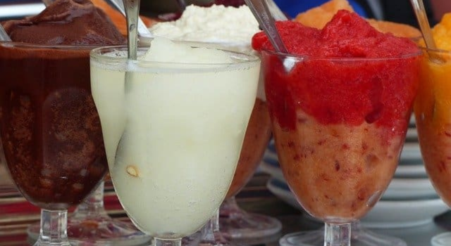 Y esto que ven son raspados y cholados. Se hace con hielo raspado, jugo de limón, trozos de frutas como piña, banano y papaya, leche condensada y a veces también se agrega jarabe de granadilla o de fresa. Una bomba. Seguro después de comerla puedes saltarte el almuerzo y la cena sin problemas.