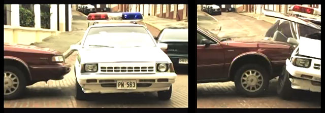 A mí me parece que en esta escena el patrulla ( Sunny de 1982, carro mega-viejo ajustado al presupuesto) fue sólo un cascarón. El impacto se parece a lo que pasa al golpear una cajeta de conflei.